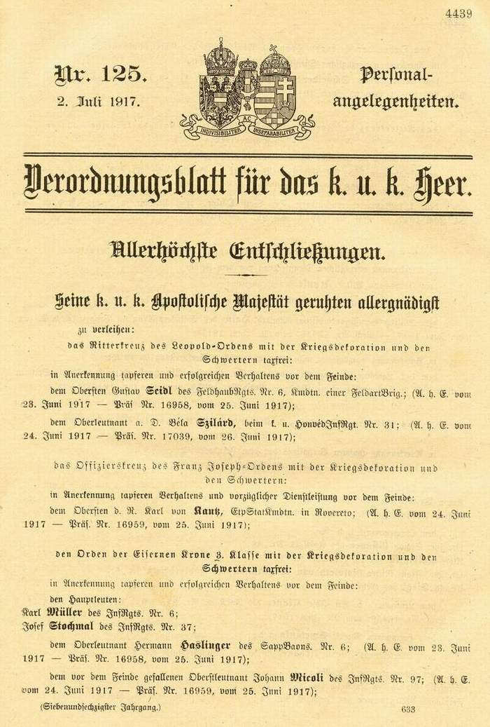 | The Army Gazette known as the Heeres-Verordnungsblatt was the document which published the awards for all members of the Common Army. Each service had its own Verordnungsblatt and all were produced weekly together in a publication known as Streffleurs Militärblatt. The page shown here is from the edition of 7th July 1917 showing the first sheet of the Common Army Personnel Matters section numbered 125 and dated the 2nd July 1917 (P.V. Bl. f. d. k.u.k. Heer Nr.125 v. 2.Juli). It shows amongst others two awards of the Knights' Cross of the Leopold Order with War Decoration and Swords to Oberst Gustav Seidl of FeldhaubRgt. Nr.6 and Oberleutnant Béla Szilárd of HonvédInfRgt. Nr.31. | |
