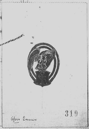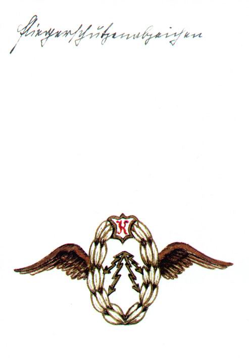 Although the propositions of the general inspector of the aviation troops were followed further on, the navy as well as also the army - in which the circle of persons actually was covered with the Luftfahrerabzeichen already - decided against the introduction of such a badge for Air-Gunners. Looking at the attached colored design drawing, that should be shaped similar to the Navy pilot badge of 1918, the question is allowed, whether - if it would have been technically possible to produce a badge of that size and form - it would be practicable to wear it at all.