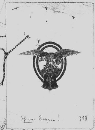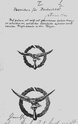 About a year later, with Res.No.2466 of the 1st of October 1916, the command of the naval aviation at Pola turned again to the navy section with an almost identical text now claiming urgently for the equality between pilots and observers. They formulated that the observers, same as the pilots, now in the meantime would be trained directly with teaching aids within the troop and also had to pass a theoretical examination. Again a design drawing was submitted, this time produced only in black ink. The description of this design: "On green, red-white-red tied, laurel-wreath a floating, natural noble falcon with an aerial bomb in the claws, ready to throw it." Notable in this context is the documenting of the war caused changing of the observer's duty, becoming more and more important to throw bombs skillfully into valuable targets beside the basic observing.