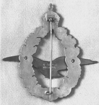 To secure the badge a very thin and sharp steel pin is found at the reverse which runs from the needle block on the rear side of the Kaiser's crown through a loop at the rear side of the initial shield. From the drawing it can be clearly seen that the pin is much longer than the badge, which in reality is rarely to be seen as it would be distinctly unpractical. Notwithstanding, this pin had a design fault, as it was easily broken and during the course of the war many field pilots had the pin replaced with practical hooks.