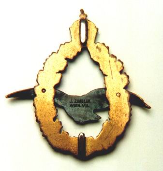 These badges were manufactured from Tombak (Bronze Alloy) consisting of a dark green enameled oval wreath with an Austrian Kaiser's crown on the upper edge. The lower edge of the wreath was formed by a white enameled shield with the initials of Kaiser Franz Joseph I - "FJI". On this wreath is a gliding eagle finished in blackened Tombak and secured with a rivet through each of the wings. At the reverse of the eagle one will find the manufacturer's mark of the firm Zimbler from Vienna VII.