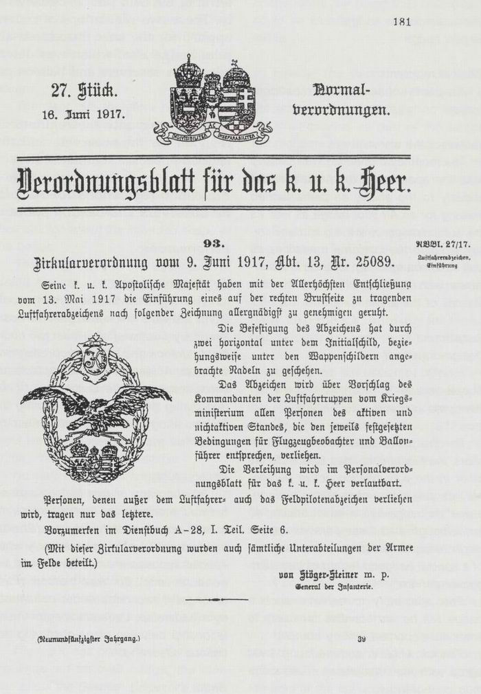 The introduction of an aircrew badge was published on the 16th of June 1917 in the k.u.k. army official order, number 27/1917: