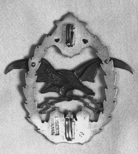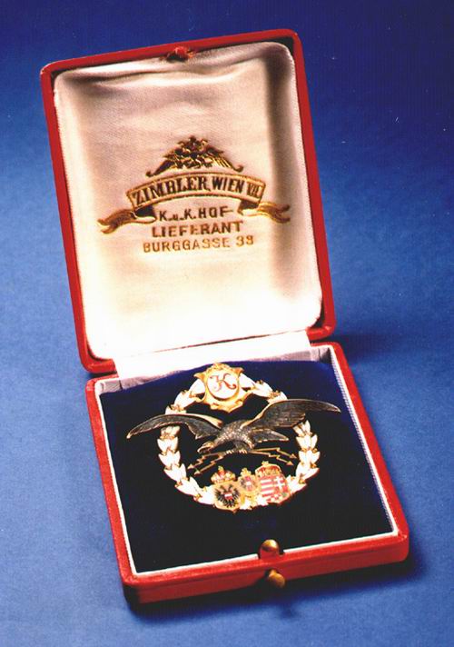 The badge was produced from tombak consisting of a white enameled laurel wreath which bore on the upper edge a decorated shield with the initial "K" on a ground of white enamel and on the lower edge the coloured enameled double arms of the Austro-Hungarian monarchy introduced in 1916. Placed on the wreath was an embossed hollow eagle with a bundle of lightening rods of blackened tombak. The eagle was brightly polished by the wearers so it took on a slightly gold look. Because of the hollow finish, the manufacturer's mark of the Zimbler firm in Vienna cannot be found on the rear side of the eagle as with the field pilot badge but next to the retaining hook on the rear side of the coat of arms shield.