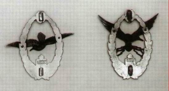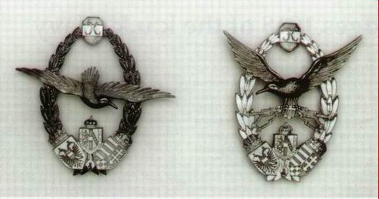 It can be seen from the enclosed drawing that here also for the most part the design of the k.u.k. army badge had been followed. The oval finished Tombak (bronze) badges were each secured at the rear with two carbine hooks. Similar to the air crew badge, a triple coat of arms consisting of the Hungarian, Austrian and Habsburg coats of arms was placed at the base. At the top of the laurel wreath was to be found the sovereign's initial on a red-white-red enamel shield. The badge for pilot's had a green enameled laurel wreath with a hovering seagull with outstretched wings whilst that of the observer was of white enamel with an ascending seagull clutching a bundle of lightening rods in the claws. The gulls were finished in black, hollow and secured to the wreath with a single rivet on each wing.