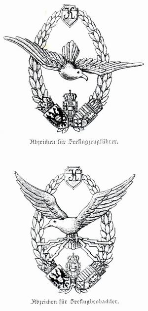 As can be seen, the k.u.k. navy followed the path of the army aviation service in its introduction of conditions for the attainment of the filed pilot's badge and aircrew badge respectively. In May 1918 another parallel change took place. The necessary flight duration was reduced to one hour and in the "Skill" category for naval observers more emphasis was placed on the mastery on air photography, radio telegraphy, machine gun handling and bomb release equipment. Additionally those flights over enemy territory in which no enemy was encountered were valid for qualification purposes.
