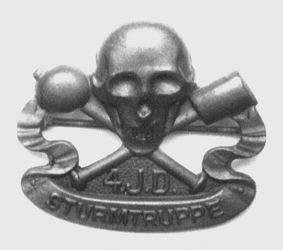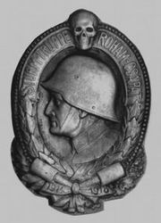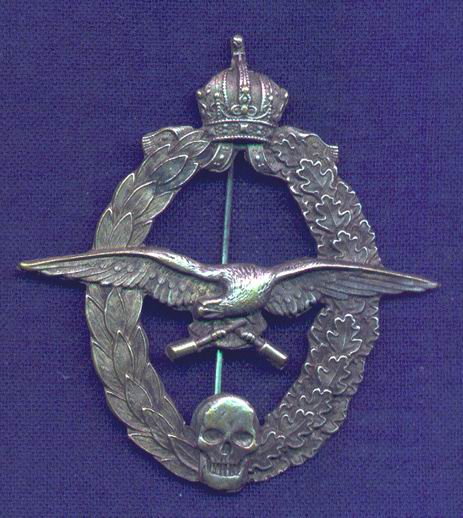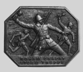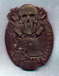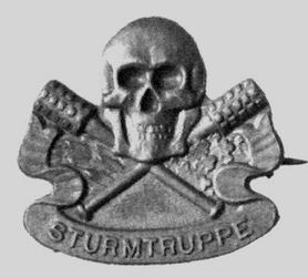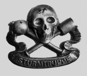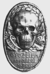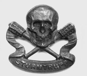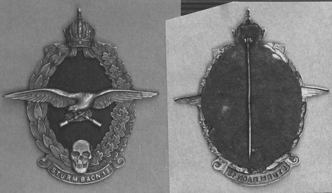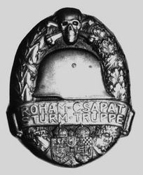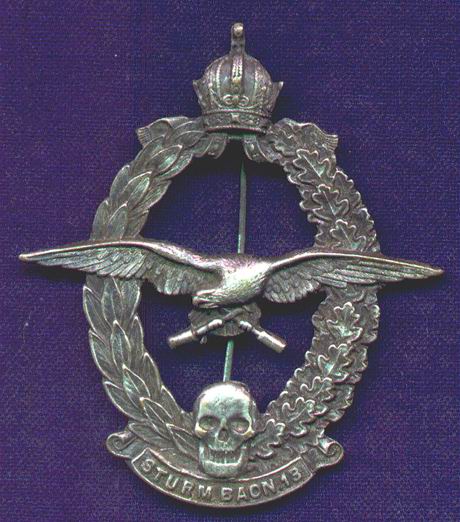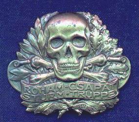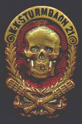 It seems at last, that there was no definite institution of the assault decoration, because neither the KM nor the Military Cabinet of the Emperor (Militärkanzlei des Kaisers und Königs) added any comments to these statutes. It looks like, that the cease-fire on the 3rd November 1918 also finished the idea of a special assault decoration. So it is obvious, that there can be no real official "Sturmtrupp-Abzeichen". But on the other hand plenty of different badges and insignia exist in present collections, which in some way deal with the subject of assault units or combat squads. And now of course the discussions started, which ones are official pieces and which ones not. To be honest, in some way it is only possible to give speculative answers; most of the official drawings of proposed badges in the war archives have disappeared and can no longer be inspected. Both, AOK and KM, strictly forbade - as mentioned above - the use of any identification badges concerning storm troopers. But lots of existing metal badges prove, that there were indeed insignias. It seems, that the topic has to be seen together with the subject of self created badges in general. Beginning from 1915, soldiers of the AH army started to found special metal insignias often showing symbols of the regiment or simply unit numbers. This effect was caused, because by and by all uniforms lost their pre-war identification elements like collar colours etc. Soldiers wanted to identify themselves as members of certain units or branches, so they put these insignias on their caps. On the other hand, these badges or insignias were sold to the public and the gained money was given to regimental charitable institutions like widow- or orphans-funds. So the whole thing started to be a big business. Thousands of different badges have been produced, often created by well known artists. The wearing of these badges was generally allowed by the KM in November 1916 (it was obvious, that it would not be possible to forbid them), but it was made clear, that they should be worn only on the right side of the cap. So when the KM and AOK refused the use of special assault badges, they forgot, that the use of cap badges was allowed. So most of the assault badges were created in that way. So from today's point of view, two different types of insignia can be found in different museums and collections. On the one hand, there are "Sturmtruppen"-badges with a concrete unit designation, for instance "Sturmbataillon 23", which can be put on on the same level as the standard regimental or unit cap badges, mostly worn on the cap. These insignias had no official character and can be seen as normal cap-badges. On the other hand insignias can be found, which (much bigger than the other ones) only got the designation "Sturmtrupp" written on the top or bottom using a human skull as the main symbol in the center. Sometimes the assault unit is also mentioned. These are often meant to be the "official" ones, which - following the above made arguments - is of course untrue. But, as we know, the time elapsing until the assault decoration was to be instituted, lasted from spring 1917 until October 1918, almost 20 months. It is obvious, that most of the best skilled storm troopers didn't want to wait until an official decoration would be founded. So they did it on their own. Many photos confirm that soldiers and officers wore these badges. The only way to make a difference between these two types, is in the method of wear. Awarded badges were mostly worn on the breast and normally larger than the others. A very interesting thing are the symbols shown on these badges. Normally hand grenades, wire cutters, helmets and always human skulls. Both, the AOK and the KM, had decided, that the skull as the main symbol should definitely not be used. So where did it come from? This question was really hard to answer, and the answer can't be definite. But it looks like, that the roots of the Austrian skull symbol leads to the German army. In July 1916, after the 150th mission, the German "Garde-Reserve-Pionier-Regiment", an engineer regiment specialized in the use of flame throwers, received a special unit decoration, the skull. All soldiers of the regiment were allowed to wear a symbolical skull on the lower part of their left sleeve. Flame thrower squads of this regiment were also performing service in Rohr´s assault battalion. It looks like, that the Austrian soldiers attending the assault courses in Beuville had noticed this badge and brought the idea to Austria.