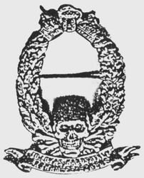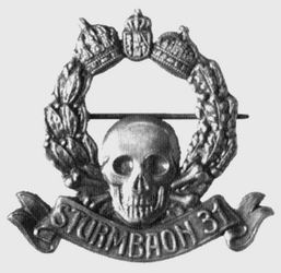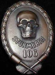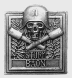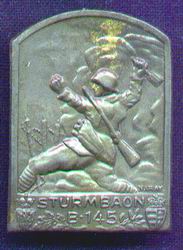 Badge for the Sturm-Baon 21 using the basic design of the common assault badge with red enamel around the skull and black enamel filling the letters |