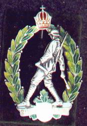 The AOK also made a suggestion concerning the look of this new decoration. Following the system of qualification badges, the storm-trooper award basically should look like the other metal-cockades worn on the right breast. But at this time it was unclear, which symbol should be in the centre of the new decoration. So all the army-groups were also asked to make propositions on this subject. In particular the corps in Army-group "GO v. Boroević" made a few very interesting comments on this topic. For instance the k.u.k. XXIVth corps concluded (29th September 1917), that only soldiers, who had passed the assault course successfully and were incorporated in an assault-battalion, -company or squad should get the chance to be awarded with the new decoration. The essential award conditions were proposed in achieving over average in shooting with the carbine and pistol, throwing hand-grenades and physical ability. So only the best men of the assault units should be decorated. But on the other hand the corps-command proposed the founding of a general metal badge for all storm troopers, being worn on the left sleeve of the coat or jacket (officers - gold; NCOs and soldiers - tombak). The k.u.k. XVth corps-command (2nd October 1917) was of the same opinion and suggested, that it should be the subordinate command, to which the assault unit belonged which would award the decoration. A special committee should examine the dignity of every proposed soldier. Concerning the symbol in the centre of the cockade, an attacking soldier with a helmet and hand-grenade was considered befitting. The VIIth corps command (4th October 1917) proposed concerning the symbolical appearance of the decoration a textile badge in regimental colour, regimental number and two "burning grenades" on the left and right side. The statement (7th October 1917) of the 1st Isonzo-army (1. ISA) is rather interesting, because the conditions of awarding the assault decoration should be, besides over average skills during training, be connected to at least one successful mission. The army-command also insisted, that the badge should differ from all the standard qualification badges used by the AH army. Instead of those, an oval insignia, quite similar to the field-pilot's decoration, should be created, also being worn on the right breast side. The army-command rejected the idea of having a committee examine whether a soldier should be awarded or not. At last the 1.ISA proposed in addition to the decoration a special assault badge, to be worn on the collar or the left sleeve, to identify all soldiers doing service in an assault unit. Concerning the appearance of the assault decoration and the badge, the use of human skulls in any way was definitely rejected, because this would, in the estimation of the army-command, cause wrong expectations. It was also proposed to change the designation of the storm troopers. They should be called "grenadiers" and the units for instance, grenadier-company or -platoon. On the 10th October 1917 the army-group headquarters "GO v. Boroević" combined all these different ideas in a statement, which was sent to the AOK. It was decided, that besides good skills in weapons handling, good results in physical education and assault tactics, at least one mission against the enemy should be a must to get the award. The soldier should be proposed by the assault-unit commander, the decoration be awarded by the superior command (mostly division-commanders). But it was also stated, that there should also be a special badge for all trained storm troopers, to raise their reputation and show their importance. As a compromise (the new infantry branch should be kept in the dark to the enemy) it was suggested, that this uniform badge should be worn only in the hinterland, but not during missions. The change of designation to "grenadiers" was also accepted and integrated into the statement. Similar to the AOK, the k.u.k. War-ministry / 5th Department (Kriegsministerium (KM)/ 5. Abteilung) also worked on the problem of assault decorations and badges. On the 10th of December 1917 the AOK asked for the KM´s estimation in this affair also including all the propositions sent from the above mentioned commands. In this document, the AOK definitely rejected the proposal of founding a uniform badge for all storm troopers. It was decided that this would be unfair towards the normal standard soldier, doing the standard service and always suffering casualties, while many new specialist branches received privileges and had better living conditions. A new badge for assault troopers would disregard them further. In that way the proposed new designation as "grenadiers" was also abandoned. In this document the AOK confirmed the award conditions of the planned assault decoration, but decided, that at least two successful missions should be necessary to get the award. The appearance was also fixed in that way, that it should be similar to the pilot's decoration, worn on the right breast. On the 3rd of May 1918 the AOK sent a model of the planned decoration to the KM and the Military Cabinet of the Emperor (Militärkanzlei des Kaisers und Königs) trying to put more emphasis on the subject. (On the same date they returned a model, showing in the centre a lion turning down a wire entanglement with his paw, to it's designer, Landsturm-Leutnant Johann Walach of Infantry Regiment number 100.) However the question was not given priority, and it was not until September / October 1918, that the War Ministry made it's point of view on this subject clear: