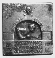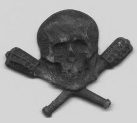 Cap Badge of the 62nd Wolhynian Battalion showing the skull & cross bones symbol | Cap-Badge with skull symbol and the inscription "Victory or Death", probably for a Hungarian Brigade. The badge is also displayed in Ulbricht's sales-catalogue * with the number 3309 | The members of Assault units were specially trained in throwing hand grenades - this general badge depicts skillful throwing. |