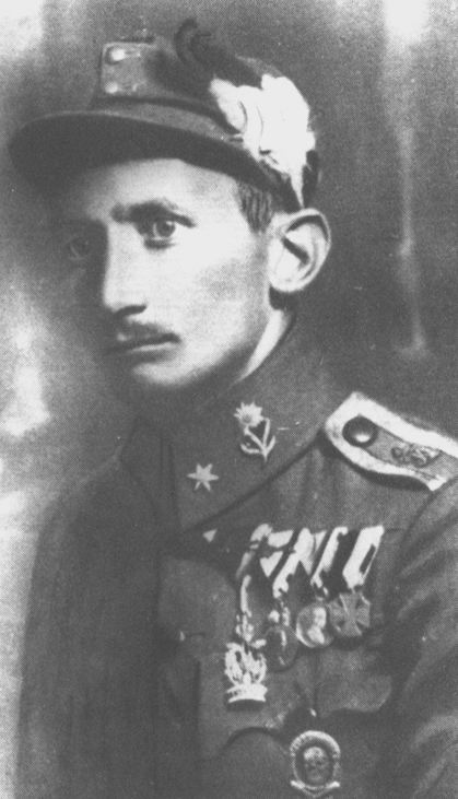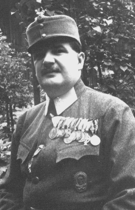 Member of Sturm-Baon 13 wearing his badge on the right breast-pocket of his tunic. | Hauptmann Rudolf Schalleck in the late 1930's, wearing the silver-variant pattern of the Sturm-Baon 13 badge on his Heimwehr-uniform. |