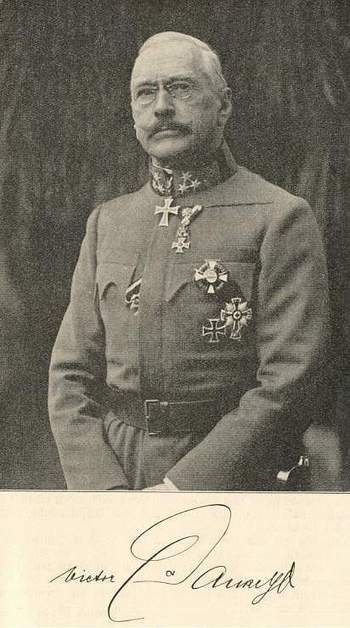 In the photograph above, Viktor Dankl still holds the rank of General der Kavallerie. He wears the Marianerkreuz of the German Order at his throat and the Star of the Austrian Society of the Red Cross with the War decoration on his left breast. He wears a "Kleine Dekoration" of the Grand Cross of the Order of Leopold on the triangular ribbon and the breast badge of his 1st Class Military Merit Cross with War Decoration on his left breast pocket flap. He is also wearing both the 1st and 2nd Class German Iron Crosses.