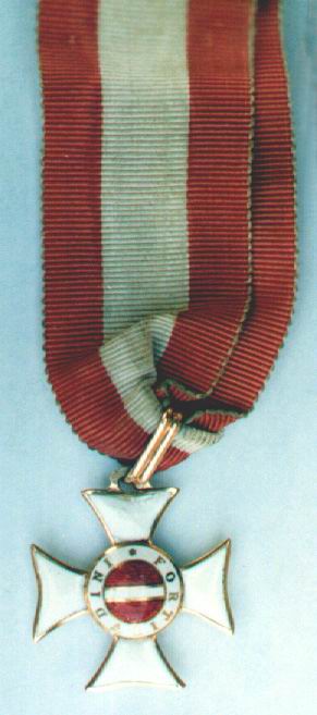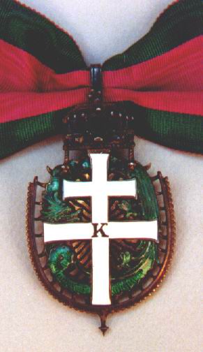 Since time immemorial there had been the desire for an outward and portable sign for the knights of the Golden Sporn which had been awarded by each respectively newly crowned king and finally this time it seems, although with some delay this was again implemented. They argued for more than a year over the appearance and financing of the new badge. Nevertheless on the 5th of April 1918, the foreign minister Graf Czernin placed before the Kaiser the appropriate statutes and regulations for wear, which he approved on the 10th of April 1918. Two Imperial decrees were written stating that this was not in itself an order but in fact it should be treated as an historical act of the King's crowning in Hungary and that the decoration was only to be worn at the throat and in no other manner. When and in what form the recipients were awarded the commemorative decoration is unfortunately not known, it did however apparently transpire before the war's end. The decoration from Emil Poppr's estate, which along with his knight's cross of the Military Maria Theresian Order are in a private collection in Austria and are shown below.