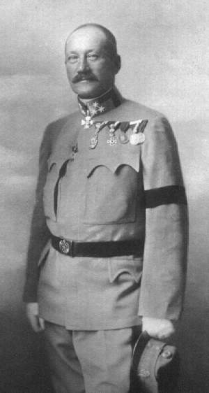 By the outbreak of the war he had attained the rank of Generalmajor der Reserve. He was immediately offered a troop command, that of the 11th march brigade which he assumed on the 1st of August 1914. For the most part this formation consisted of Galician-Ruthenian personnel which went to the assistance of the 3rd corps which was engaged against superior Russian forces in hard fighting in eastern Galicia. The battle however developed unfavourably and Schönburg's brigade suffered severe losses. On the 8th of September 1914 he received the command of the 88th Landesschützenbrigade which was composed in the main from alpine troops. Following the retreat over the San, to Przemysl and further to Gorlice, the Austrian army again went on the offensive. The 3rd army to which his brigade was subordinated managed to liberate Przemysl for only a short period before it again had to retreat. In December he took part with his troops in the successful battle of Limanowa-Lapanów. Here the 88th Landesschützenbrigade was deployed where ever the situation was critical. Fürst Schönburg-Hartenstein, since October a Feldmarschall-Leutnant was always to be found in the front lines. Wounded on Christmas Eve 1914 he allowed his soldiers to remove an enemy bullet from his shoulder.