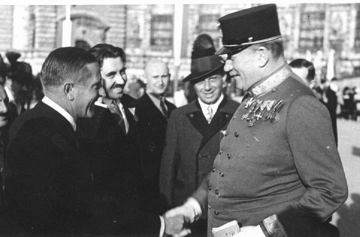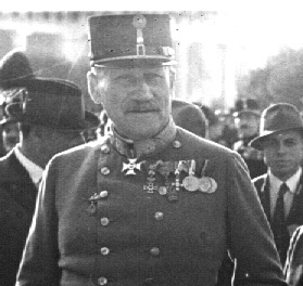 Generaloberst Fürst Schönburg greets MMThO winner Peter Scheider in the thirties. Click to enlargeIn the days of the revolution his house in Vienna was seized, while the Czechs expropriated his possessions in Moravia. However Schönburg remained as an important  political figure in the following years on account of his posts as president of the Austrian state comrades and war veterans association and the union of catholic nobles. After various visits in1928 and 1930 with Kaiserin Zita and the heir apparent Otto in Spain, the already 75 year old strict catholic and monarchist was appointed state secretary for defence on the occasion of a cabinet reshuffle under Chancellor Dollfuss on the 21st September 1933 and became the minister of defence on the12th of March 1934. Already three months later Generaloberst Schönburg retired from the government as his program for an apolitical army and the abolition of the Habsburg amendment could not be executed.