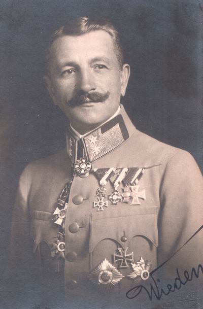 Heinrich graduated from the Militär-Oberrealschule at Mährisch-Weißkirchen and the military academy at Wiener Neustadt being assigned as a Leutnant to Feldjäger-Bataillon number 30 on the 1st of September 1888. He volunteered for FJB number 30 because his older brother Eduard was an Oberleutnant there. It is interesting to compare the two brothers, whilst the elder one started as a simple cadet with the troops his younger brother had had the opportunity to attend the two most prestigious officers' preparatory institutes of the monarchy and at last in 1918 the 6 years younger Heinrich held the rank of Feldmarschall-Leutnant while Eduard only achieved the rank of Oberst! But Heinrich was also a military talent. After graduating from the War School at Vienna he was transferred, meanwhile promoted to Oberleutnant on the 1st of November 1892, permanently to the General staff-Corps on the 1st of May 1893. He was first employed as general staff officer of the 56th infantry brigade at Laibach where he received his promotion to Hauptmann 1st class of the general staff corps on the 1st of May 1896 - one notch in seniority higher than Dr. Karl Bardolff! On the 29th of May 1897 Heinrich Wieden Edler von Alpenbach married the 10 years younger Maria Magdalena Rüling Edle von Rüdingen und Rüdennen, called Magda, the daughter of a Hofrat with whom he had a daughter Elisabeth Maria Magda, born at Laibach on the 5th of December 1902. Under the name of "Lilly Proksch" she later became a well known dancing artist and owner of a dancing school in the years between the wars. On the 1st of September 1897 he was assigned to the military academy at Wiener Neustadt as an instructor - together with Geza von Lukachich with whom he became friends - here the (German) Austrian from an old Styrian family and there the Hungarian of an old Croatian family which had moved to Hungary in the 16th century. Following their tours of duty as instructors both continued their careers with the Austrian and Hungarian Landwehr respectively. On the 16th of August 1901 Heinrich Wieden Edler von Alpenbach was transferred to troop duty with the newly formed Landwehr infantry regiment number 27 at Laibach. For his distinguished period as an instructor he was honored with a commendation of the war ministry of the same date.