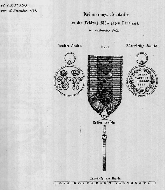 The round, 29mm in diameter, medal showed on the obverse the crowned initials of both rulers, the Austrian medal "FJ" on the viewers left while the German medals had the "W" on the left. On the reverse the inscription in four lines :"UNSERN TAPFEREN KRIEGERN 1864" (our heroic fighters 1864) was encircled by two laurel twigs which were bound on the bottom by a bow ribbon. Along the rim of the medal the words: "AUS EROBERTEM GESCHUETZ" (from captured guns) were embossed. The ribbon displayed the colors of both rulers - basic black with a white and a yellow stripe on the margins - while the Austrians used to wear this medal on a 40mm wide triangular ribbon with a yellow stripe on the viewers left while Germans used a smaller (normally 34mm but also 36mm or 38mm could be found) wide straight ribbon with the white strip to the left. For some later awards and also for replacement purposes some medals were produced in "common" light bronze without the inscription along the rim which were a little (about 3g) lighter and had a smaller loop to fix the ring for the ribbon on the top. (Of course contemporary veterans were not too concerned regarding these details concerning the ribbon and the replacement medals!)