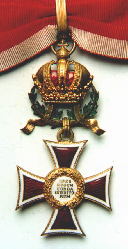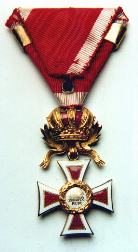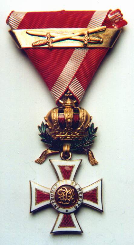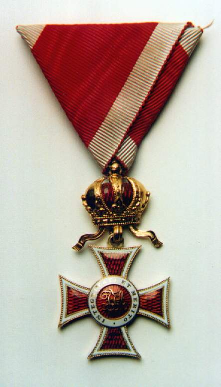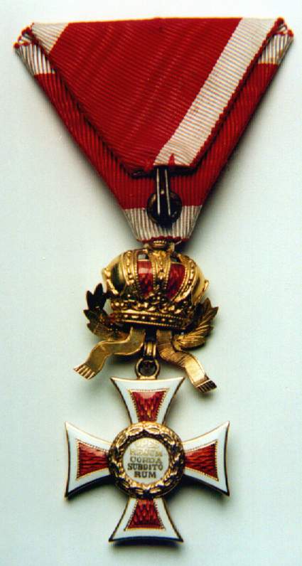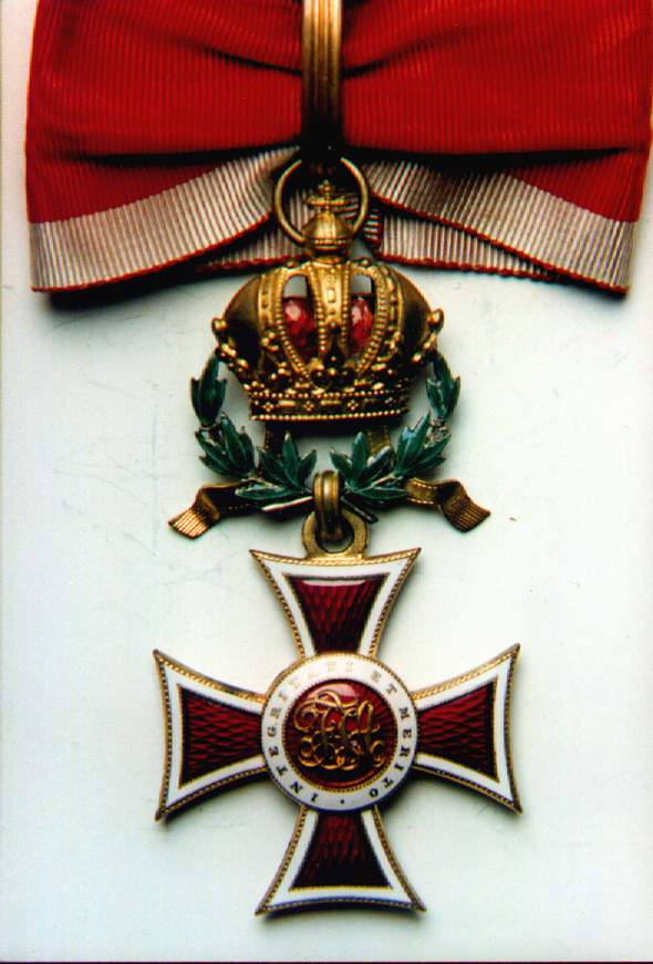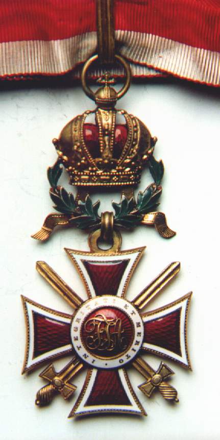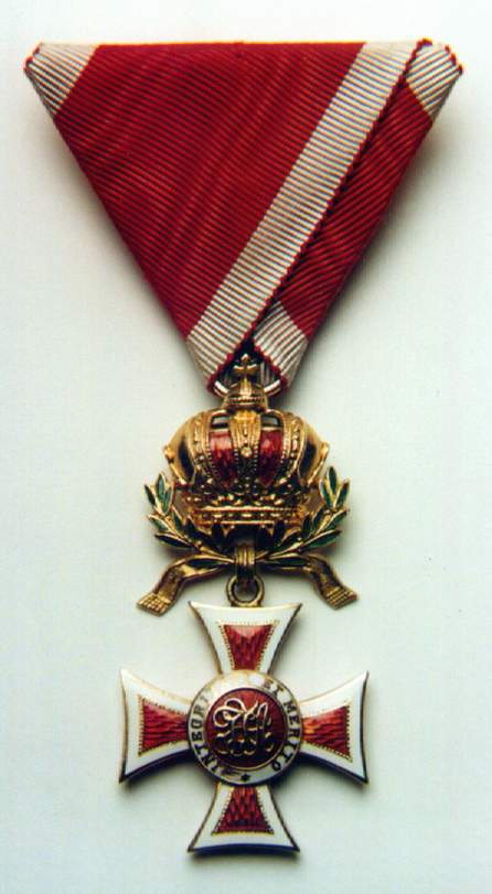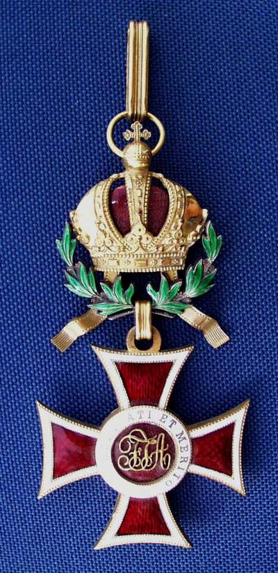Ritterkreuz or Knights' Cross. Photo courtesy of Jörg C. Steiner. Click to enlargeThe Order of Leopold was founded by Kaiser Franz I on the 8th of January 1808. The order's statutes published on the 14th of July of the same year stipulated originally only three grades: Grand Cross, Commander and Knight. A War Decoration to the Order was introduced on the 23rd of February 1860 which took the form of a gold Laurel Wreath. During the war, in common with the other Austro-Hungarian decorations Crossed Swords were instituted to reward bravery in the face of the enemy. An Imperial Decree of the 1st of February 1901 ordered that in future the senior grade would be split into two separate awards and from then onwards there were four distinct Ranks of the Order: