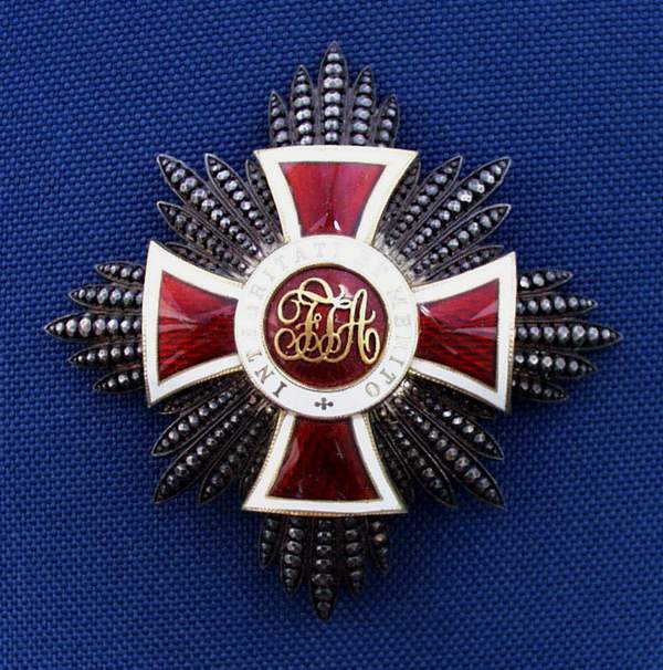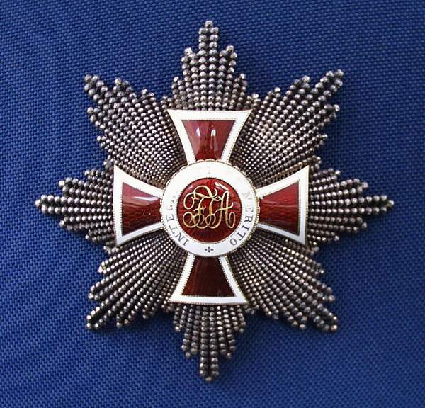 Both the Grand Cross and the First Class Members of the Order wore on formal occasions their orders in the form a Sash with the Order attached to the Bow and an 8 pointed breast Star. The Grand Cross was somewhat larger than the First Class as was the the width of the Sash. The Commanders' Cross was worn suspended  from a 52mm wide ribbon at the throat and the Knight wore his Order on a triangular ribbon on the left breast. The actual Order consists of a red enameled cross, with white enamel edging. The obverse of the Order displays the initials "FJA" in gold on a red enamel background. The Motto of the Order was "INTEGRITATE ET MERITO". The reverse bears the inscription "OPES REGUM CORDA SUBDITORUM". The ribbon of the Order is red with two narrow white stripes. The Cross is surmounted by a golden Emperors' Crown.