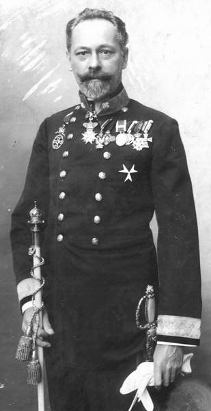 The Ordens-Kanzlist or Chancery Clerk of the Order of Leopold in 1910: Hof-Zeremoniell-Direktor Wilhelm Friedrich Nepalleck. Of particular note is his badge of office worn suspended from the top button of his tunic and  his "Master of Ceremonies" Staff.  Courtesy of Jörg C. Steiner.