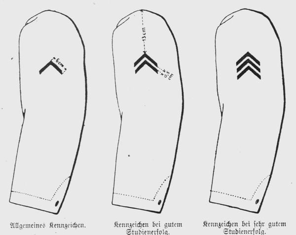 Before the first course started the particular dress regulations for the pupils was published on the 14th of September 1917. They were to be dressed like common soldiers with field grey uniforms: standard field cap, jacket and greatcoat without shoulder-straps or cords, trousers with puttees, no side arms were introduced. The facing color was to be black and the usual balloon symbol should be worn on the collar. To differentiate between these pupils and common soldiers of the aviation-troops a 6 cm wide chevron of yellow 1 cm wide silk lace (similar to the NCOs collar-lace) was prescribed to be worn on the upper left sleeve of the jacket and the greatcoat. Students who displayed a good effort were to wear two such chevrons and those who displayed excellence three - as shown on the drawings below.