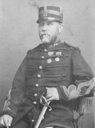 Eduard von Pawlowsky, born 1833 at Pest volunteered as an hussar for the Corps. For his performance at Ajalpa he was honored with the Golden Military Merit Medal and promoted to Leutnant. End of 1866 he was promoted to Oberleutnant and joined the Mexican National Army as a Rittmeister 2nd class of the Red Hussars. He was commander of the small patrol which escorted Kaiser Maximilian to Quetétaro where he was honored with the knight's cross of the Order of our beloved Madonna of Guadalupe and captured at the end. After his return to Austria he entered the Hungarian Honvéd infantry in 1869 and eventually attained the rank of Major. He published his memoirs in the Hungarian language in Budapest in 1882. | Photo of an unidentified French officer of the 38th infantry