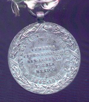 With the imperial order of the 29th of August 1863 the French Emperor Napoleon III. instituted a commemorative medal to honor those men of the armed forces who fought in Mexico. The medal displayed the projected period of the campaign 1862-1865, medals of the very first issue even showed the dates 1862-1863, but finally it took longer than planned and de facto the whole period from 1862 to 1867 was covered. The round silver medal is 30 mm in diameter, a four times bound wreath of laurel leaves surrounded a 24 mm plain shield showing on the obverse the garlanded head of Napoleon III., looking to the left, surrounded by the inscription "NAPOLEON III EMPEREUR" and at the bottom the small hallmark of the artist "BARRE". On the reverse the plain centre shows the names of the major battles in five lines "CUMBRES/CERRO BORREGO/SAN LORENZO/PUEBLA/MEXICO" and is surrounded by the inscription "* EXPEDITION DU MEXIQUE *" on the upper half and the dates, separated by a point on the bottom. On the bottom bound of the laurel wreath is to be found the rectangular silver hallmark. The plain ribbon shows a cross of the Saint Andrew type with a green and a red beam behind a black, uncrowned Mexican eagle with a green snake in its beak.