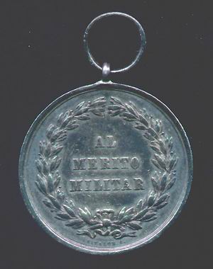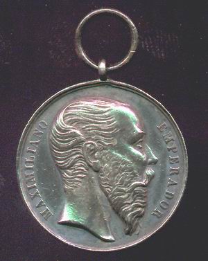 Instituted in 1865 to honour all kinds of military merit and acts of bravery in the field in three classes - Bronze, Silver and Gold. The round medals, 32 mm in diameter, were to be worn on a plain red ribbon. The obverse shows the head of Kaiser Maximilian, looking to the right with the surrounding inscription "MAXIMILIANO EMPERADOR". The reverse shows in three lines the inscription "AL/MERITO/MILITAR" surrounded by two laurel-twigs bound on the bottom by a bow, at the bottom is the name of the artist "NAVALON.G.". At the Münzkabinett of the Viennese Kunsthistorisches Museum where the orders, medals etc. of Maximilian are stored they give the weights of the golden medal at 26,7 grams and for the silver medal at 16,9 grams in their catalogues.